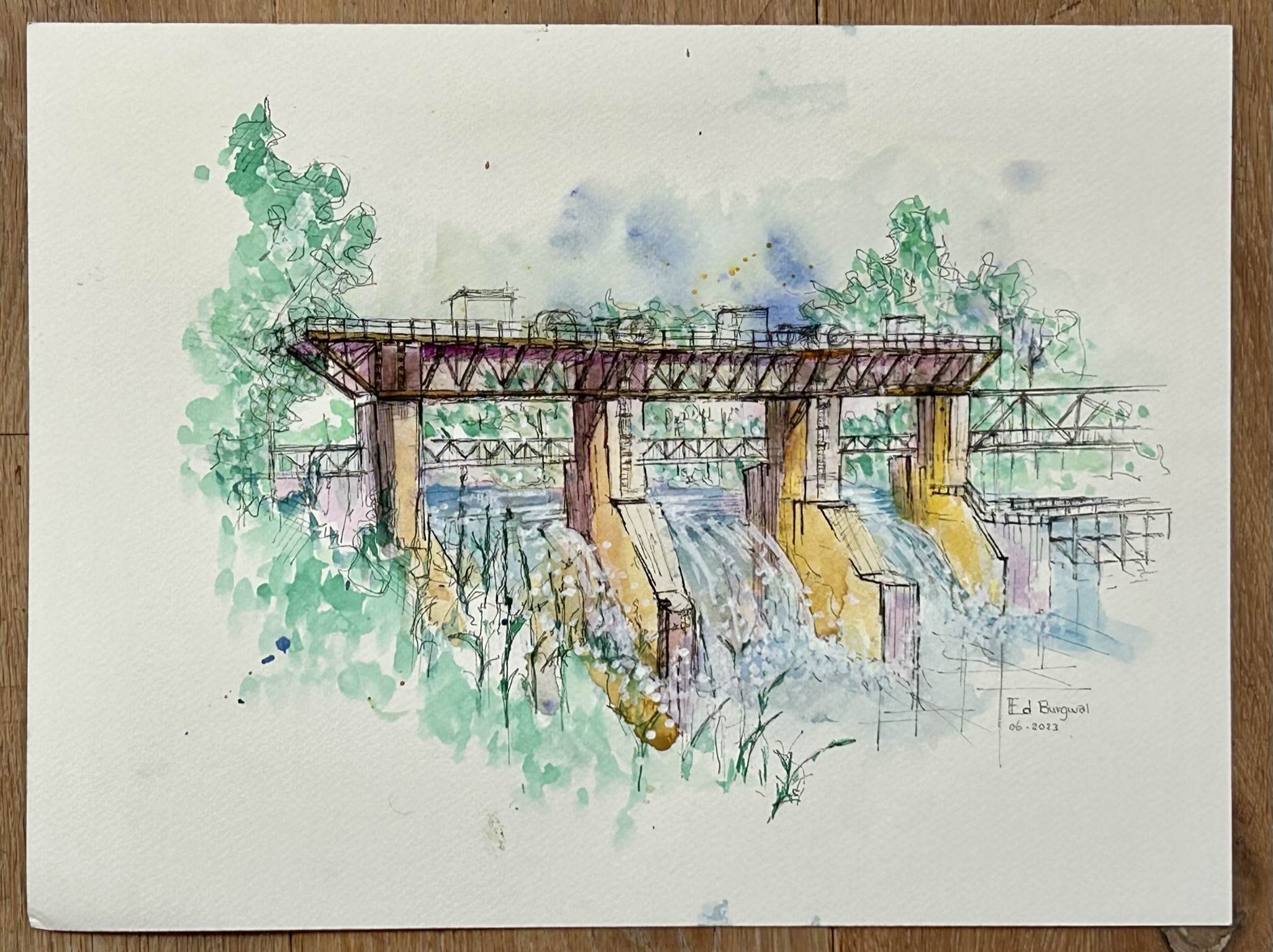 Read More“Dit levendige urban sketch-schilderij, gemaakt met inkt en aquarel, toont de indrukwekkende Stuw van Linne. Het kunstwerk vangt de kracht
