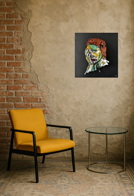Het materiaal waarvan ze is opgebouwd, spreekt boekdelen. Gerecycled plastic, afkomstig uit consumptieafval, smelt samen tot een gelaagd portret dat net zo broos is als haar uitdrukking. De ruwe textuur, het glanzende oppervlak, de gescheurde randen en grillige lijnen maken het beeld rauw en eerlijk. Hier is geen verfraaiing, geen idealisering. Alleen waarheid.